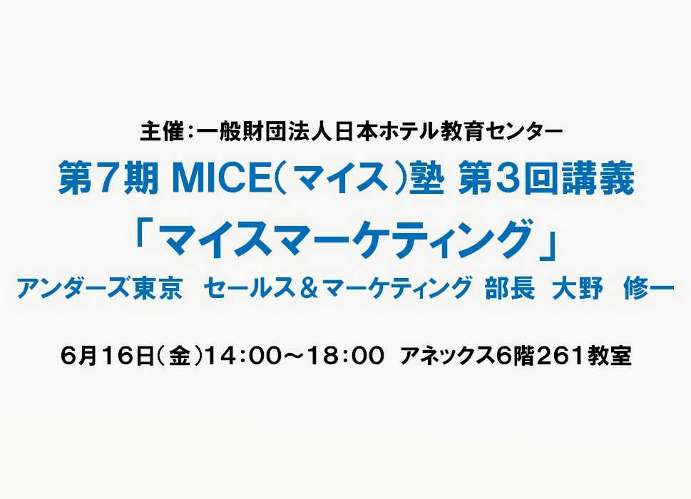日 時:2017年6月16日(金)14:00〜18:00 テーマ:マイスマーケティング 講 師:アンダーズ東京 セールス&マーケティング 部長 大野 修一氏